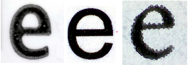 Si ens proposem observar al detall un material imprès, ens serà molt més fàcil identificar en quin procés d’impressió s’ha fet si utilitzem un comptafils. Vegem com una mateixa tipografia observada a través del comptafils ens permet diferenciar detalls propis i distintius dels diferents processos d’impressió. D’esquerra a dreta, flexografia, offset i gravat en relleu.