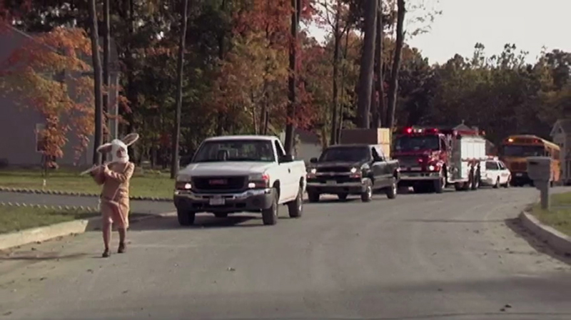 Per exemple, en la peça Streamside Day Pierre Huyghe utilitza un muntatge lineal al llarg d’un dia de celebració en una petita zona residencial. En el muntatge, però, introdueix elements simbòlics modificant el temps de la narració habitual amb un temps més propi del mite, un temps que a vegades sembla oníric. Streamside Day no solament és el film sinó també la invenció d’una festa que es repetirà anualment per a construir una nova tradició en una comunitat nord-americana de creació recent. Pierre Huyghe inventa així la història d’una comunitat.