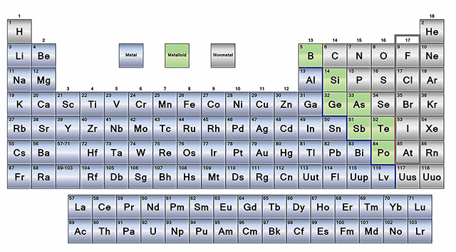 Taula periòdica dels elements on s’indiquen en blau els metalls, en verd els metal·loides i en lila els no-metalls