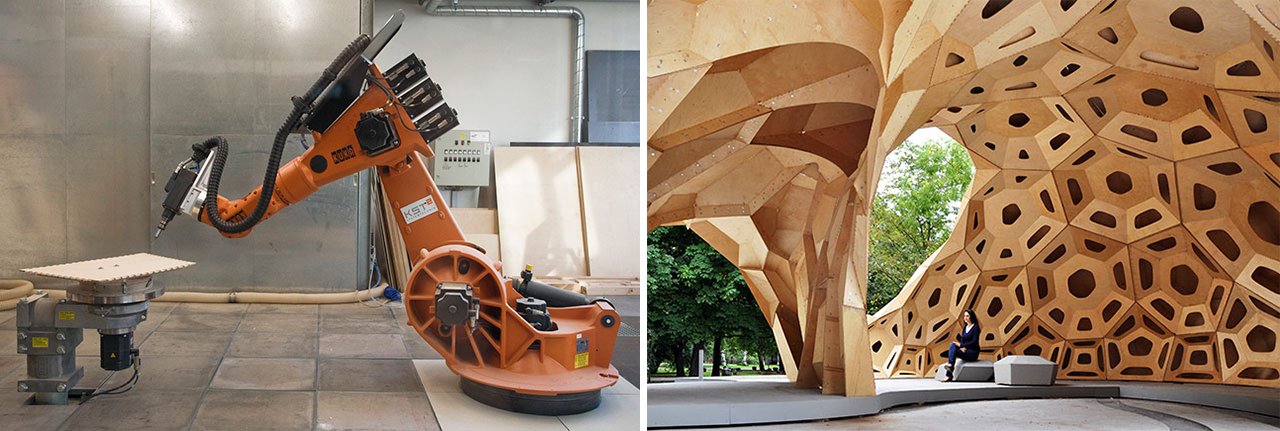 El centre de recerca de Stuttgart ICD/ITKE fa múltiples recerques constructives amb mòduls prefabricats i tecnologia d’impressió 3D. A la imatge veiem una construcció realitzada a partir de mòduls fresats.