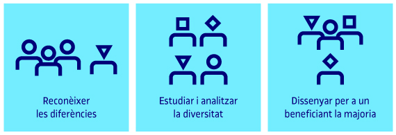 Els dissenys que minimitzen o eliminen els prejudicis de raça, gènere, sexualitat i edat poden oferir igualtat d’oportunitats per a tots i ajudar a crear productes i serveis que responguin millor a la diversitat. El disseny inclusiu sintetitza en tres principis bàsics les regles a seguir per aconseguir sobreposar-se als nostres prejudicis i condicionants socioculturals: