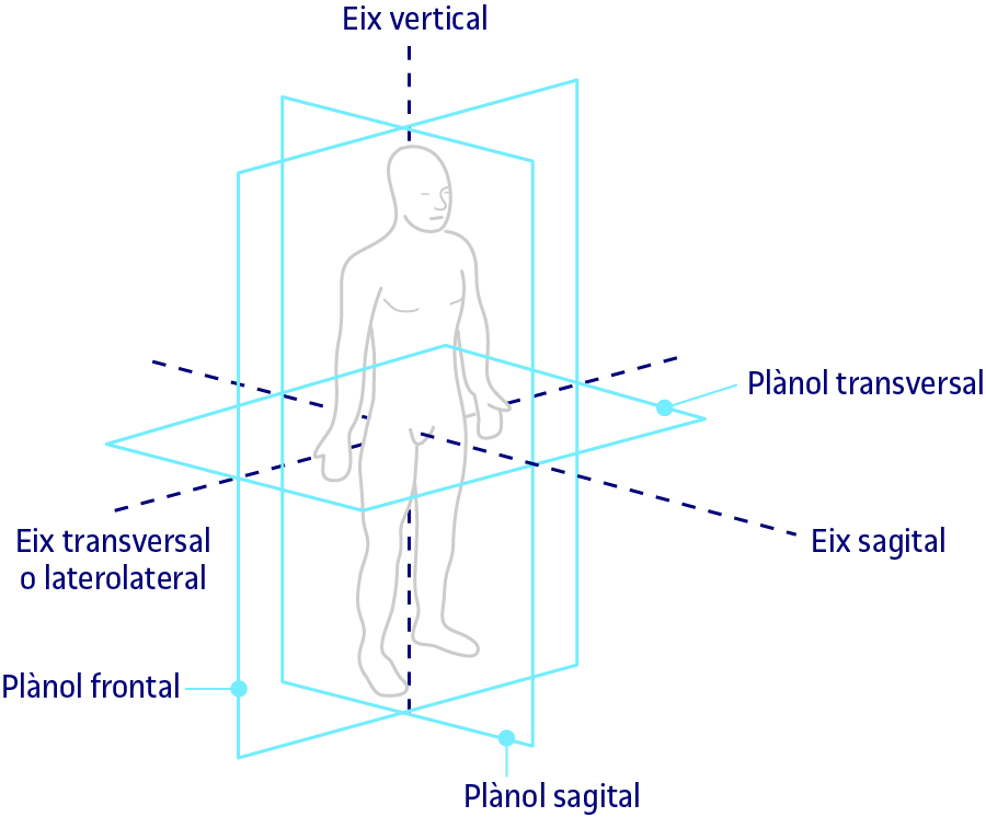 Els moviments naturals que es poden realitzar amb el cos i les extremitats estan determinats pels sistemes que estructuren l’aparell locomotor (esquelet, músculs i articulacions). Aquests moviments ens permeten adoptar diferents postures en l’espai que ens envolta i són l’origen de les sensacions propioceptives que ens informen de la nostra posició i ubicació espacial. La classificació d’aquests moviments s’ordena a partir de tres plans ficticis que divideixen el cos humà en funció de les direccions que poden seguir els moviments. L’estructuració geomètrica de l’espai es correspon, també, amb els plànols del cos humà. Un pla horitzontal denominat transversal, un pla frontal i un pla lateral denominat aquí sagital.