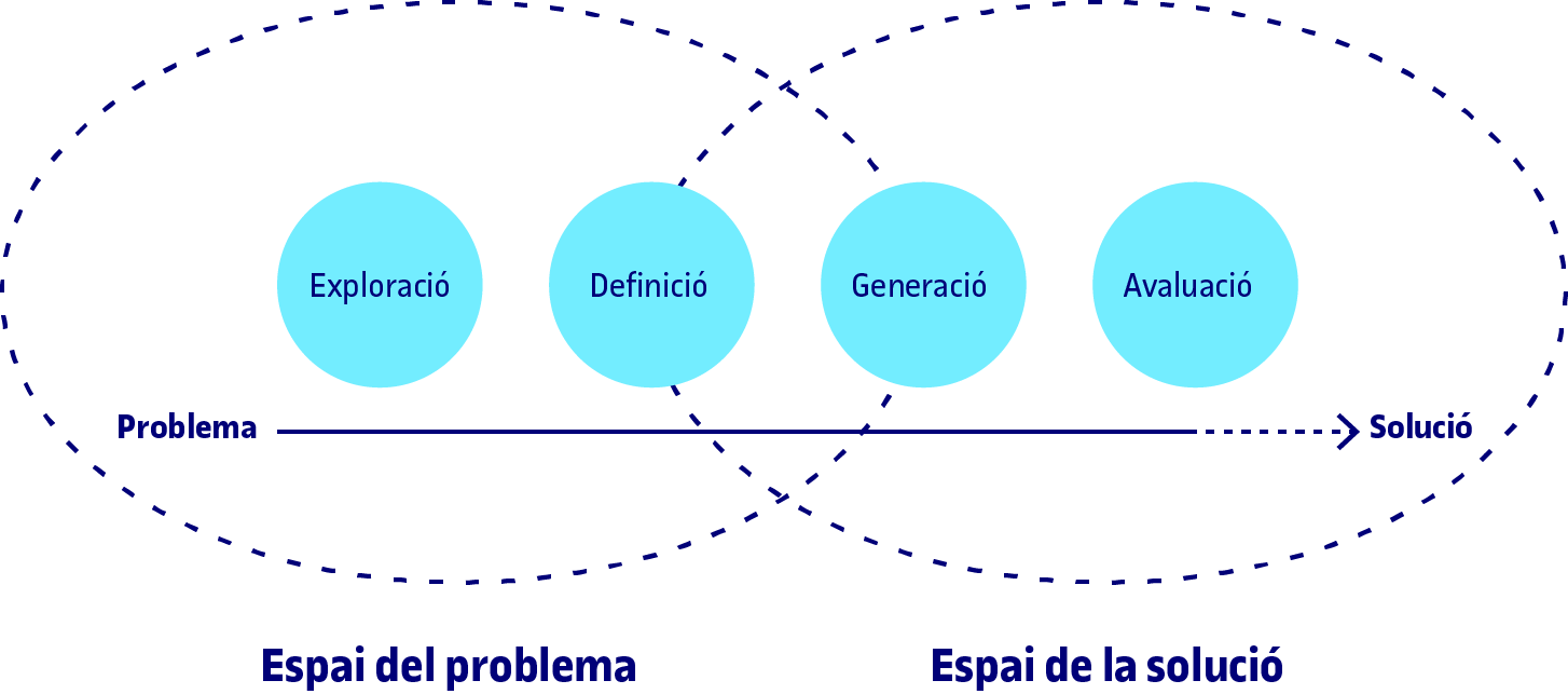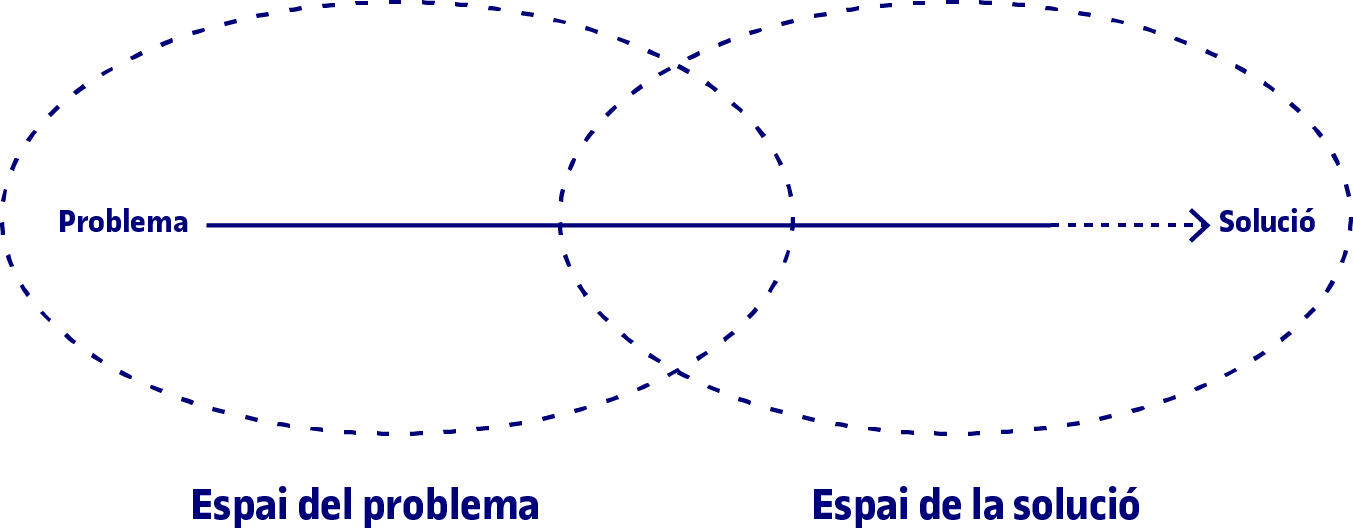 En qualsevol procés de disseny trobem el que s’anomena l’espai del problema i l’espai de la solució. El resultat al qual volem arribar se situa en l’espai de la solució. En aquest espai hi ha totes les etapes de treball que són «visibles», és a dir, tots els diagrames, proves de concepte, prototips, wireframes, esbossos, etc. Quan dissenyem i treballem en una solució concreta, aquesta se situa en l’espai de la solució. En canvi, quan encara no hem començat a treballar en una solució concreta, quan encara no tenim res tangible, ens trobem en l’espai del problema. En aquest espai és on conviuen els requisits del projecte, l’encàrrec del client i les necessitats de les persones usuàries.