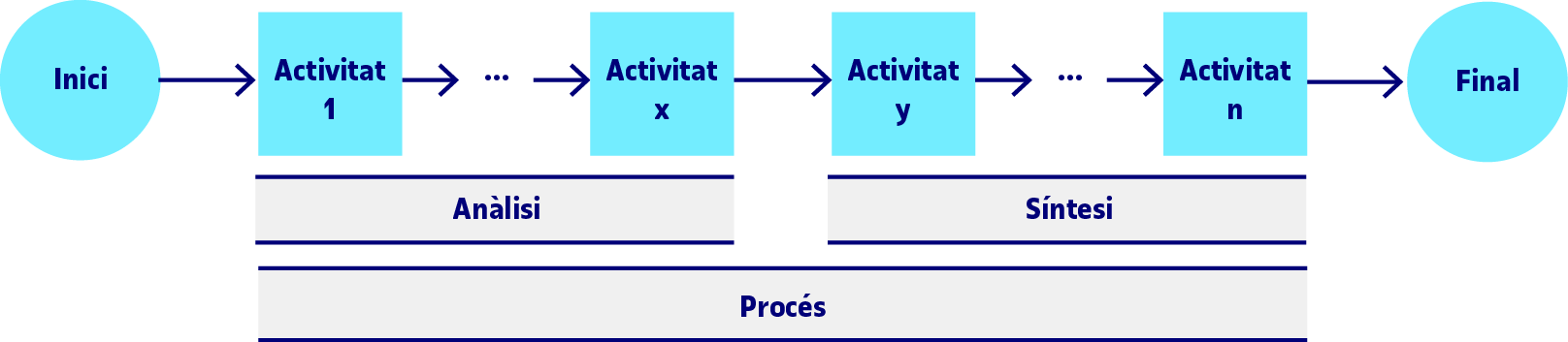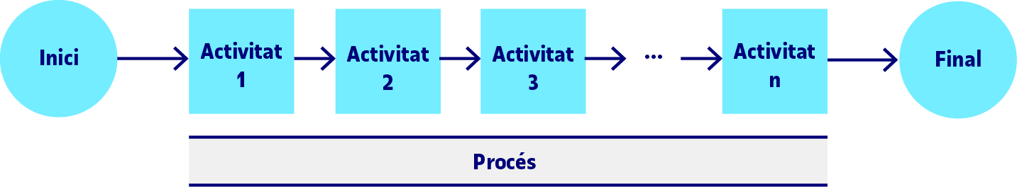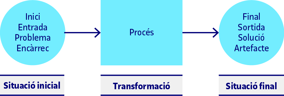 De manera esquemàtica, un procés es pot entendre com allò que cal fer, el camí a seguir, per a arribar a un resultat o situació final a partir d’una situació inicial. Així, a partir de la situació actual i mitjançant un conjunt d’accions l’objectiu és arribar a una situació futura que es considera millor que l’actual. Això, tot i que ara ens sembli evident, significa que la situació inicial o punt de partida presenta un conjunt de mancances o problemes. La situació inicial pot ser una entrada, un encàrrec o un problema i, llavors, com a situació final podem tenir una sortida, una solució o un artefacte. Podem representar-ho amb un diagrama molt senzill: