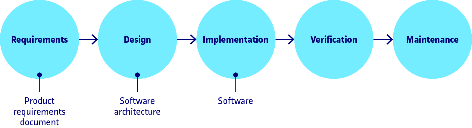 Segurament és el procés amb un model més simple. Defineix un conjunt d’etapes i d’activitats que s’han de portar a terme de manera seqüencial, on el resultat de cada etapa constitueix l’entrada a l’etapa següent. No hi ha una metodologia o model fixat per al procés en cascada, tot i que normalment inclou aquestes fases:
