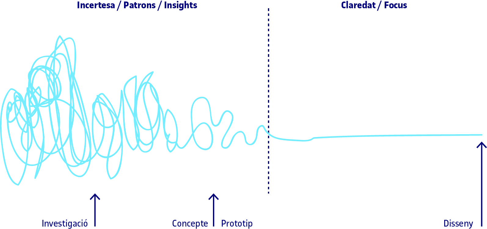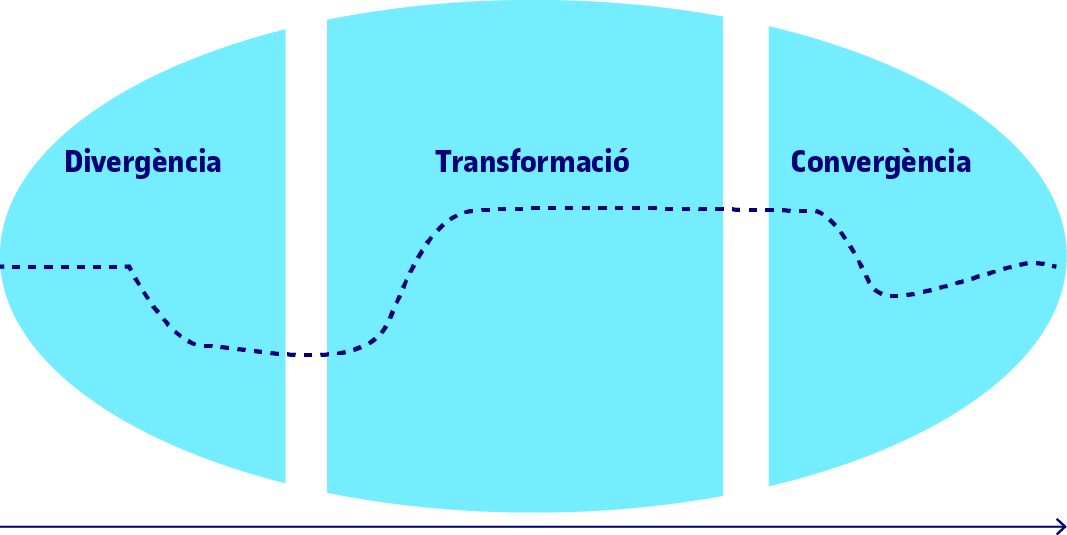 En la primera etapa té lloc un procés de divergència per tal d’entendre el problema, buscar i recórrer el seu espai, generar idees, estendre’n els límits i crear incerteses. L’etapa de transformació es basa principalment a identificar patrons i la darrera etapa és un procés de convergència basat a reduir incerteses, seleccionar idees i caminar cap a una solució.