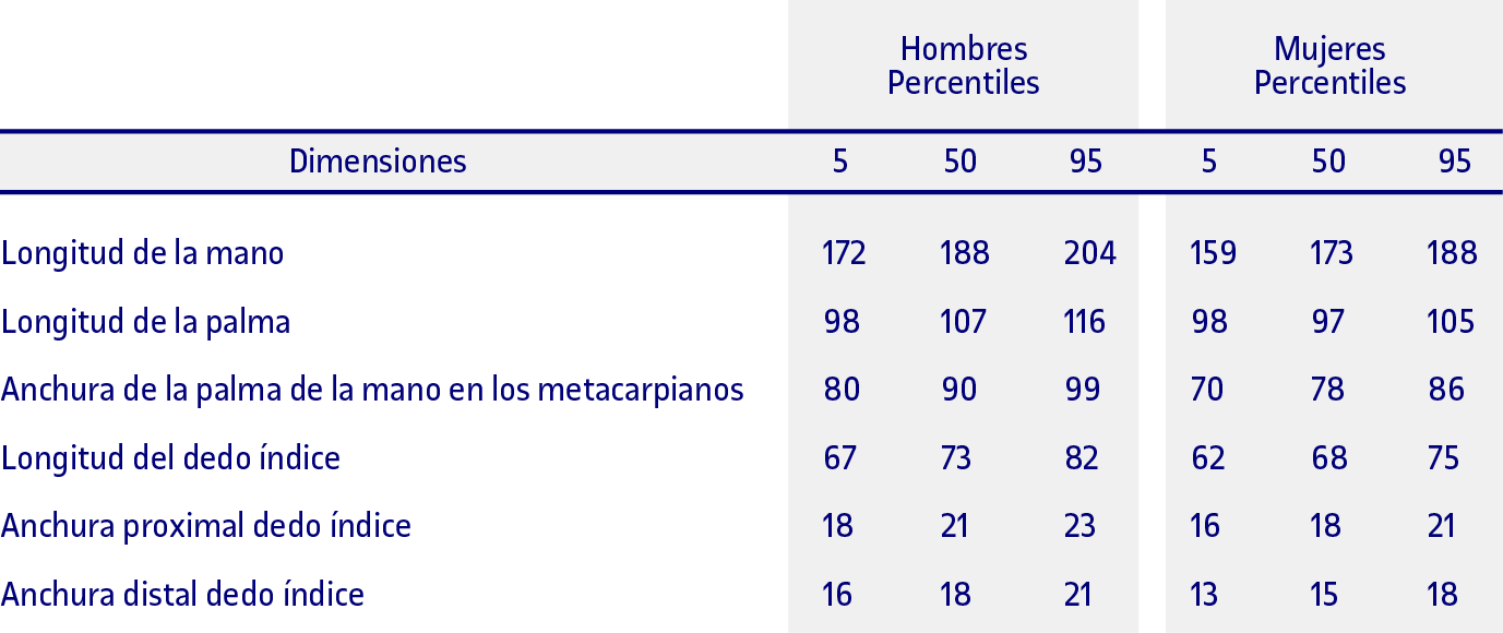 En la tabla inferior se indica que las dimensiones de la mano para el percentil 5 de hombres es 172 mm. El percentil expresa que un 5 % de la población analizada presenta una longitud de la mano de 172 mm o inferior, mientras que un 95 % de los hombres analizados tienen una longitud de la mano superior a ese valor.