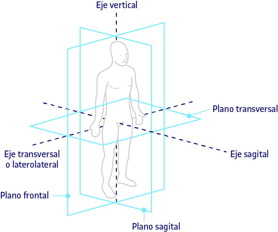 Los movimientos naturales que se pueden realizar con el cuerpo y las extremidades están determinados por los sistemas que estructuran el aparato locomotor (esqueleto, músculos y articulaciones). Estos movimientos nos permiten adoptar diferentes posturas en el espacio que nos rodea y son el origen de las sensaciones propioceptivas que nos informan de nuestra posición y ubicación espacial. La clasificación de estos movimientos se ordena a partir de tres planos ficticios que dividen el cuerpo humano en función de las direcciones que pueden seguir los movimientos. La estructuración geométrica del espacio se corresponde, también, con los planos del cuerpo humano. Un plano horizontal denominado transversal, un plano frontal y un plano lateral denominado aquí sagital.