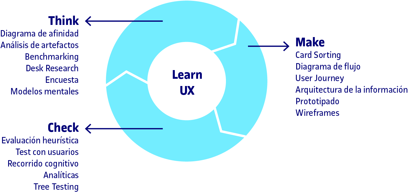 El proceso de diseño lean también depende de cada proyecto. A menudo se habla de cuatro etapas iterativas: idea, build, launch, learn; aunque también es válido reducirlas a tres: think, make, check: